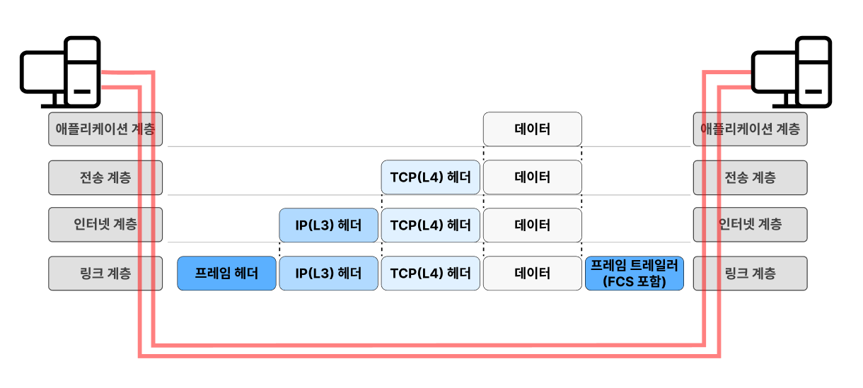 - 인캡슐레이션: 상위 계층의 헤더와 데이터를 하위 계층의 데이터 부분에 포함시키고 헤더를 삽입하는 과정