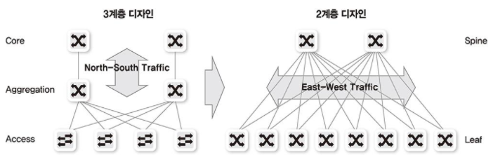 - 기존은 3계층 구성이 일반적이었으나 2계층 구성인 스파인-리프(Spine-Leaf) 구조로 변화