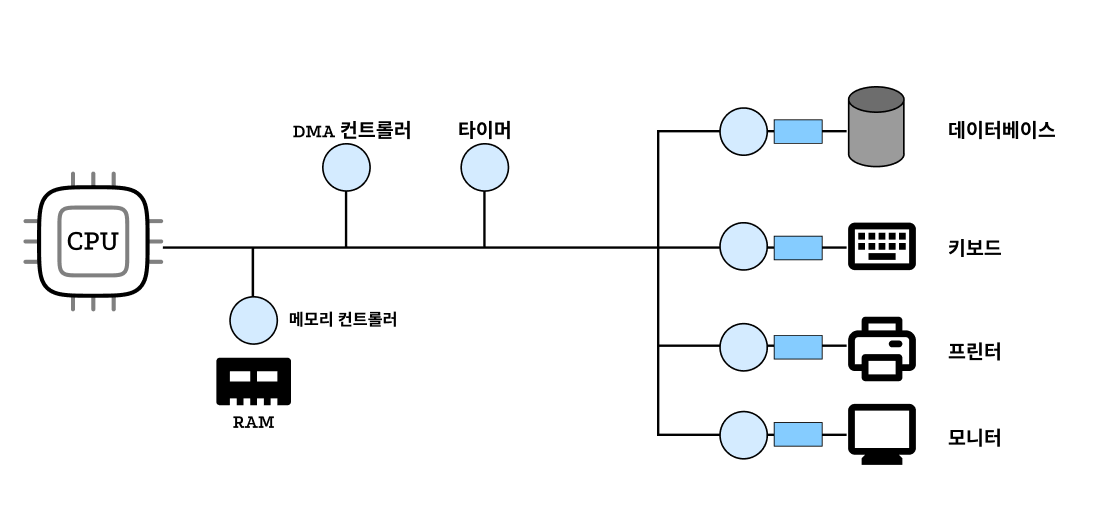 - 각 하드웨어 장치에는 컨트롤러가 붙어 있다.