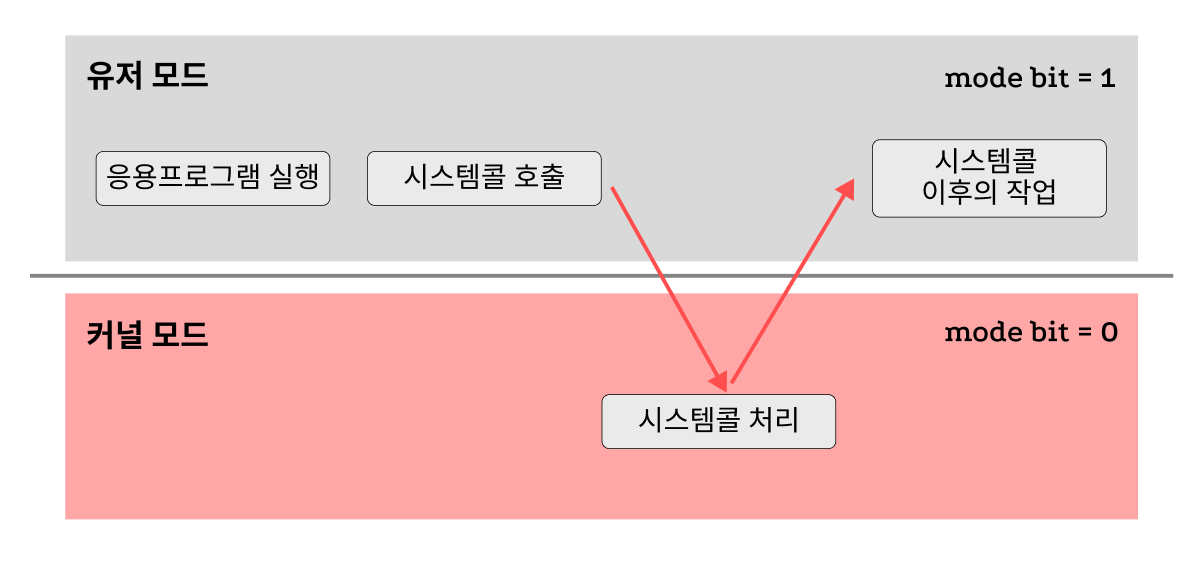 - 운영체제가 요청된 작업을 마친 후 모드비트를 1로 만들어 사용자 프로그램에게 넘겨줌