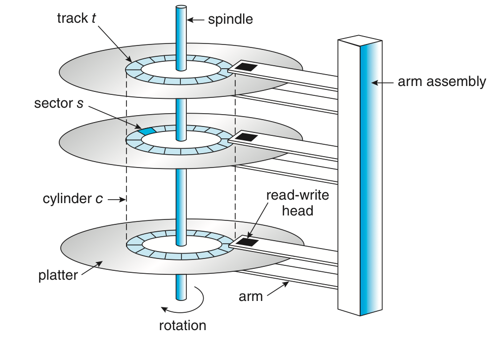 - 여러 개의 마그네틱 원판이 있고 암(arm)이 이동하며 원판에 저장된 데이터를 읽고 씀