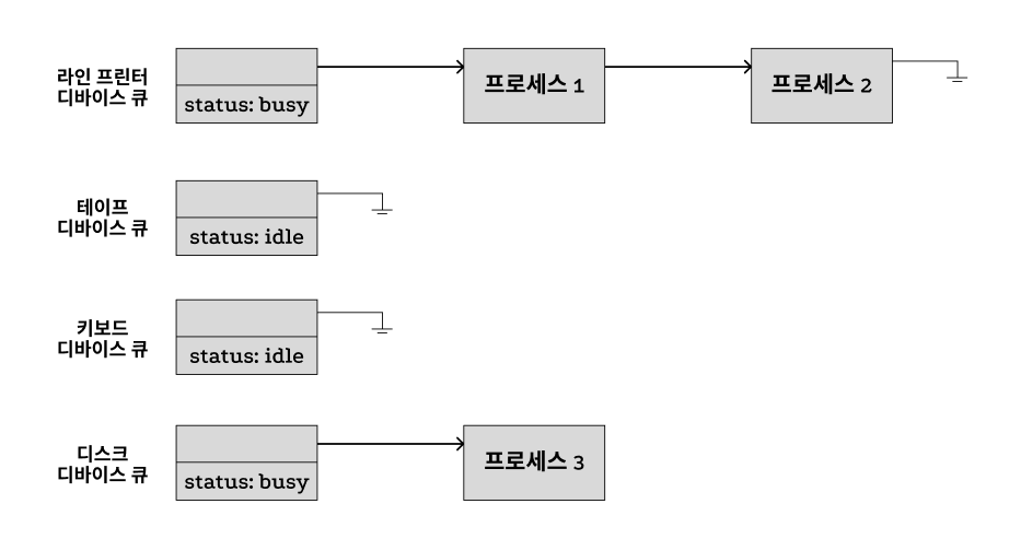 - 입출력의 동기화를 위해 큐(queue)를 두어 요청한 순서대로 처리할 수 있도록 함