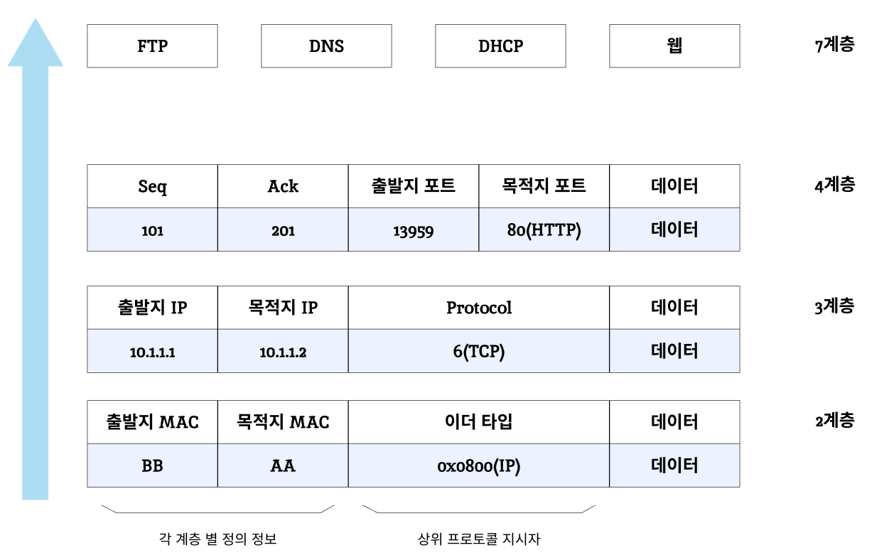 - 각 계층에서 정의한 정보는 수신 측 동일계층에서 쓰기 위함