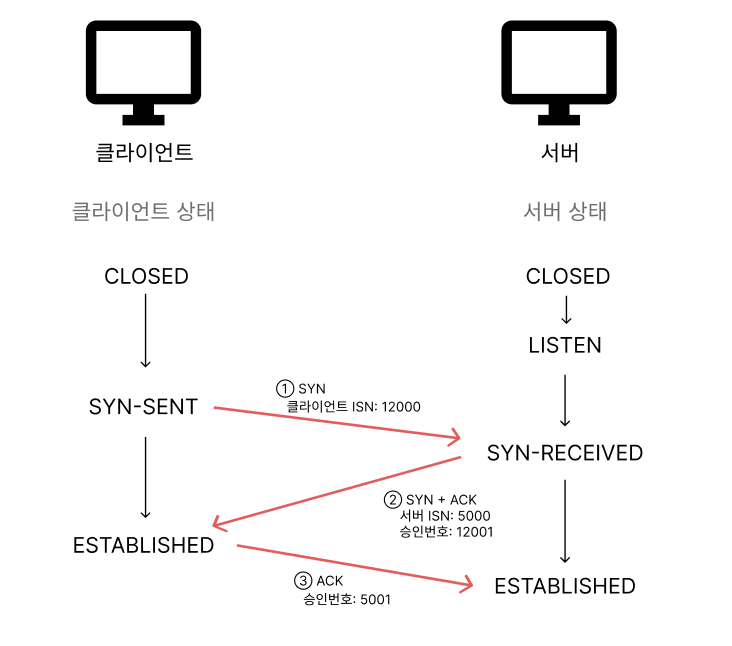 - ACK 단계: 클라이언트는 서버의 ISN + 1한 값의 승인번호를 담아서 서버에 보냄