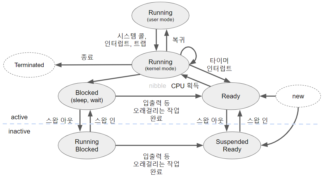 - 프로세스의 상태는 실행(running), 준비(ready), 봉쇄(blocked, wait, sleep)로 구분
