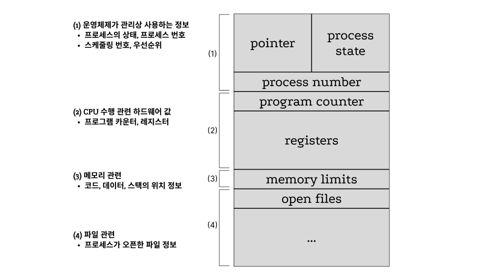 - 입출력 상태 정보: 프로세스가 오픈한 파일의 정보 등의 프로세스의 입출력 상태 정보