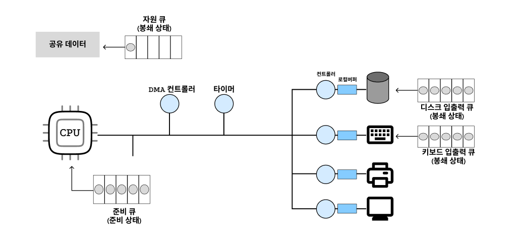 - 프로세스 준비 큐 외에도 운영체제는 자원별로 장치 큐를 둠