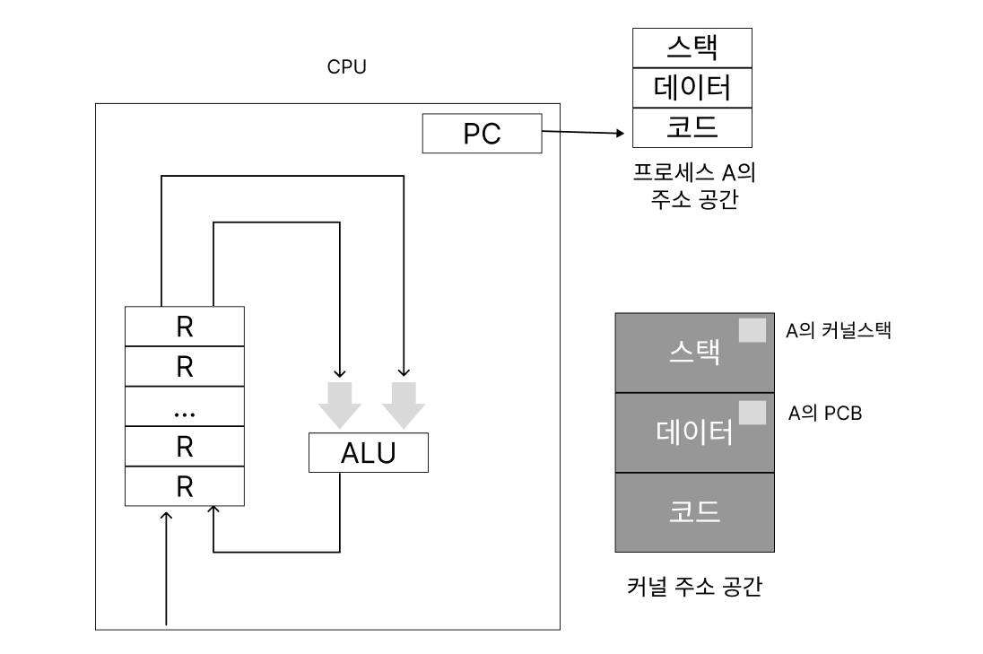 - 실행 중인 프로세스는 사용자모드 실행 → 커널모드 실행으로 바뀜