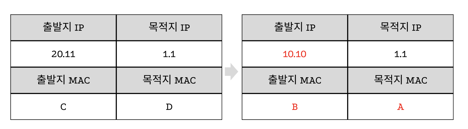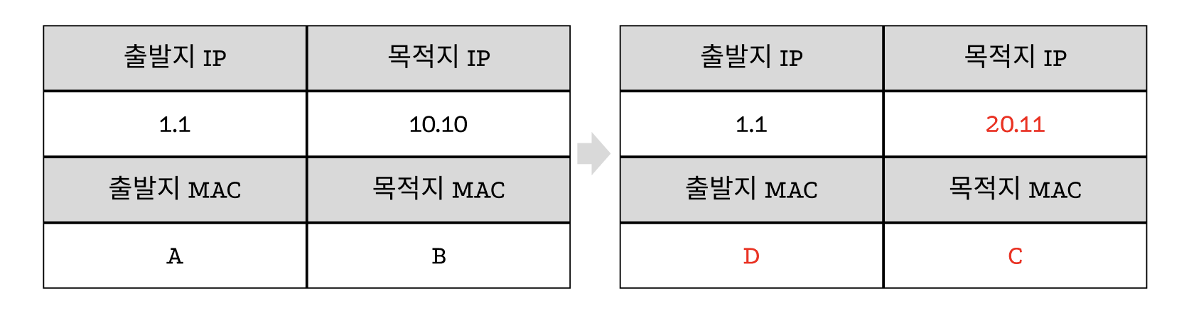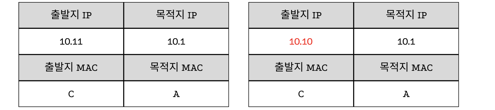 - 목적지 IP 주소 10.10 → 10.11, 목적지 MAC 주소 B → C