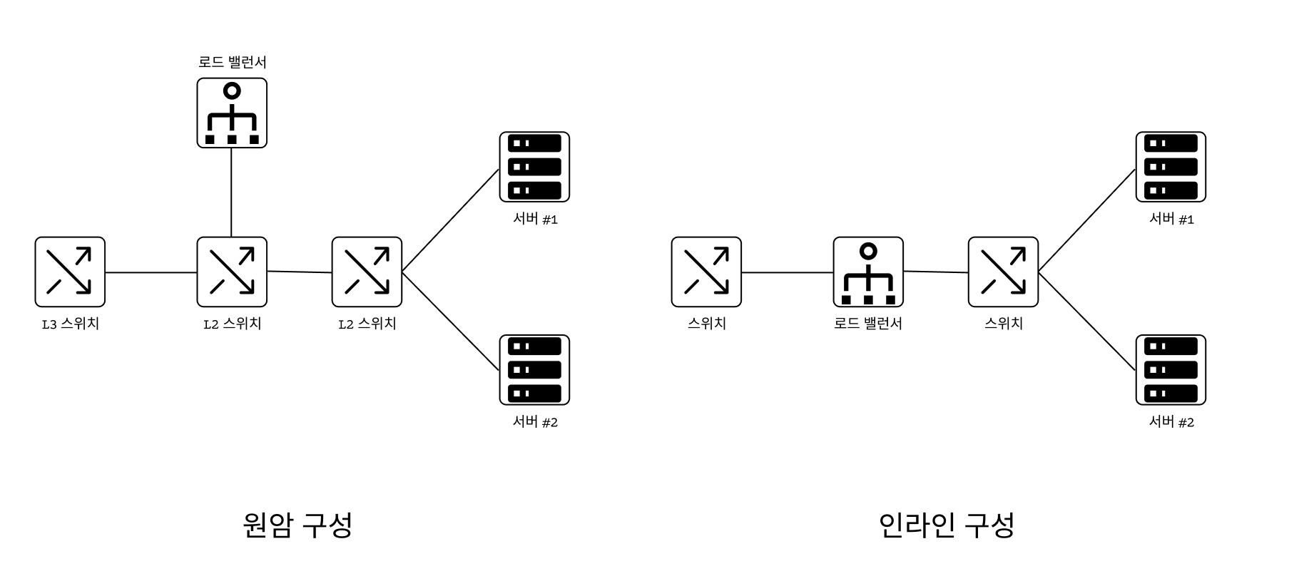 - 서버로 가는 경로 상에 로드 밸런서가 연결되는 구성