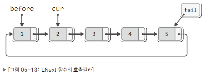 - LNext 함수는 무한 반복 호출이 가능하며 리스트의 끝에 도달할 경우 첫번째 노드부터 다시 조회 가능