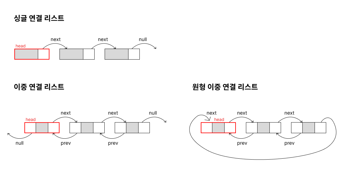 - 원형 이중 연결 리스트: 이중 연결 리스트와 같지만 마지막 노드의 next 포인터가 헤드 노드를 가리키고 있다.