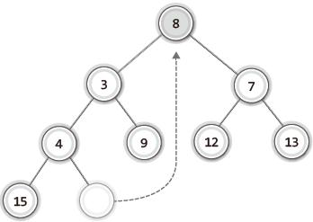 - 마지막 노드를 루트 노드 자리로 옮긴 후 자식 노드와의 비교를 통해 자기 자리를 찾게 함.