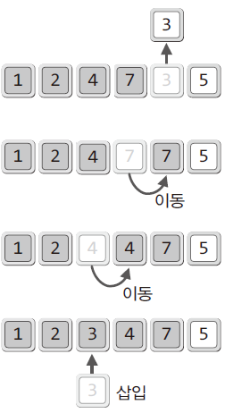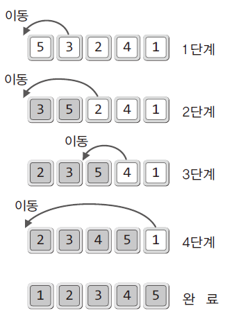 - 정렬 대상을 두 부분으로 나눠 정렬 안 된 부분에 있는 데이터를 정렬된 부분의 특정 위치해 삽입해 가면서 정렬을 진행하는 알고리즘