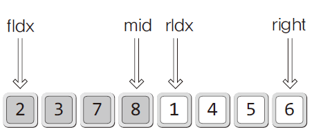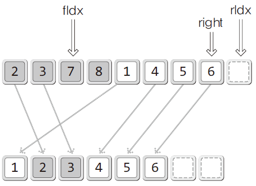 void MergeTwoArea(int arr[], int left, int mid, int right) { int fIdx = left; // 왼쪽 영역의 첫번째 위치 정보 int rIdx = right; // 오른쪽 영역의 첫번째 위치 정보 int i; int * sortArr = (int*)malloc(sizeof(int)*(right+1)); // 병합 결과를 담을 메모리 공간 할당 int sIdx = left; // 병합할 두 영역의 데이터들을 비교하여 // 정렬순서대로 sortArr에 하나씩 옮겨 담는다. // 두 영역 중 하나의 영역이라도 모두 다 담길 때까지 while(fIdx <= mid && rIdx <= right) { if(arr[fIdx] <= arr[rIdx]) sortArr[sIdx] = arr[fIdx++]; else sortArr[sIdx] = arr[rIdx++]; sIdx++; } // 앞 부분이 모두 sortArr로 갔다면 남은 뒷부분은 자동으로 sortArr 뒤로 다 처리 if(fIdx > mid) { for(i=rIdx; i <= right; i++, sIdx++) sortArr[sIdx] = arr[i]; } // 뒷 부분이 모두 sortArr로 갔다면 남은 앞부분은 자동으로 sortArr 뒤로 다 처리 else { for(i=fIdx; i <= mid; i++, sIdx++) sortArr[sIdx] = arr[i]; } // 병합결과를 옮겨 담기 for(i=left; i <= right; i++) arr[i] = sortArr[i]; free(sortArr); }