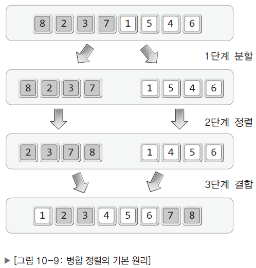 - 병합 정렬은 “분할 정복” 알고리즘 디자인 기법에 근거하여 만들어진 정렬 방법