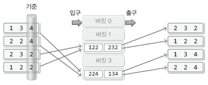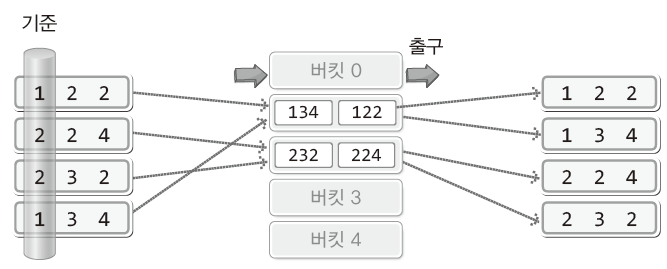 - 기수 정렬은 데이터를 구성하는 기본 요소, 즉 기수를 이용해서 정렬을 진행하는 방식