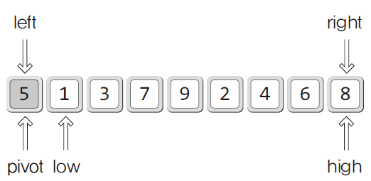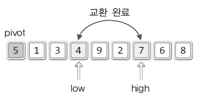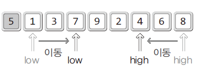 - 이동을 완료한 후에는 high와 low가 가리키는 데이터를 서로 교환함