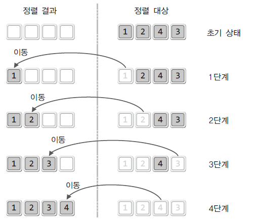 - 정렬 순서상 가장 앞서는 것을 선택해 가장 왼쪽으로 이동시키고 , 원래 그 자리에 있던 데이터는 빈 자리에 가져다 놓는 방식