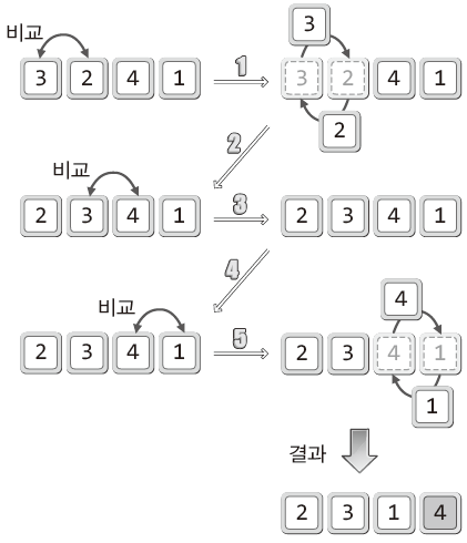 - 앞에서부터 순서대로 비교하고 교환하는 일련의 과정이 거품이 일어나는 모습에 비유되어 이름이 지어짐