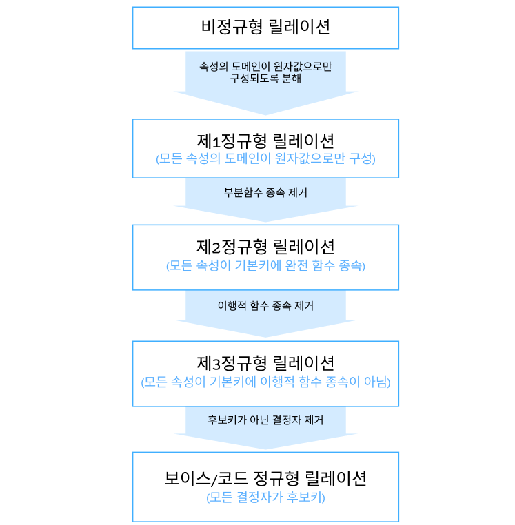 - 정규화는 이상 현상이 발생하지 않도록 릴레이션을 관련이 있는 속성들로만 구성하기 위해 릴레이션을 분해하는 과정