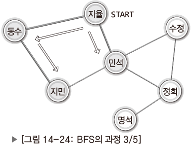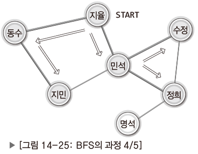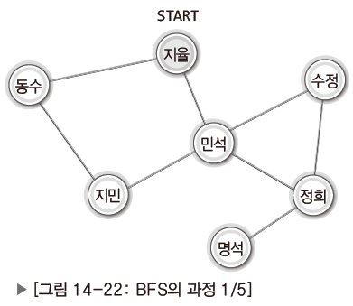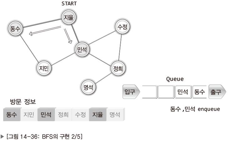 - 큐에서 하나 꺼내어 해당 노드와 인접한 노드를 찾고 그 중 방문하지 않은 노드를 다시 큐에 넣는다.