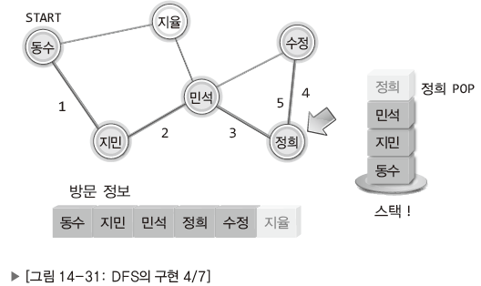 - 만약 연결된 노드 중 방문하지 않은 곳이 없다면 스택에서 꺼내어 확인한다.