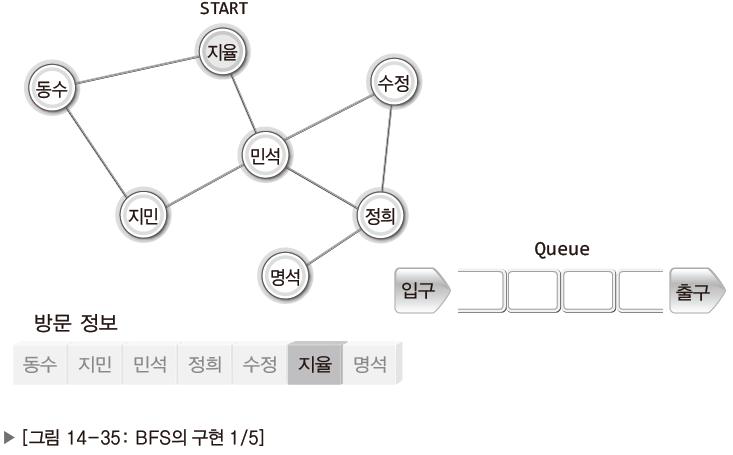 - 연결된 인접 노드의 정보가 큐에 순서대로 들어감.