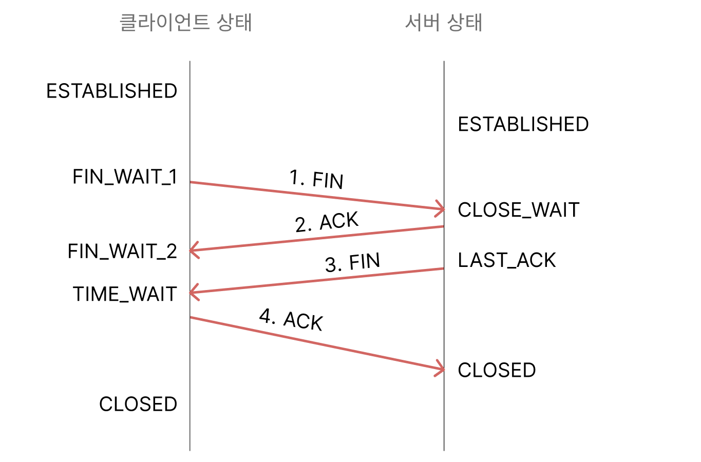 - 먼저 클라이언트가 연결을 닫으려 할 때 FIN으로 설정된 세그먼트를 전송, 이후 FIN_WAIT_1 상태로 들어가 서버 응답을 기다린다.