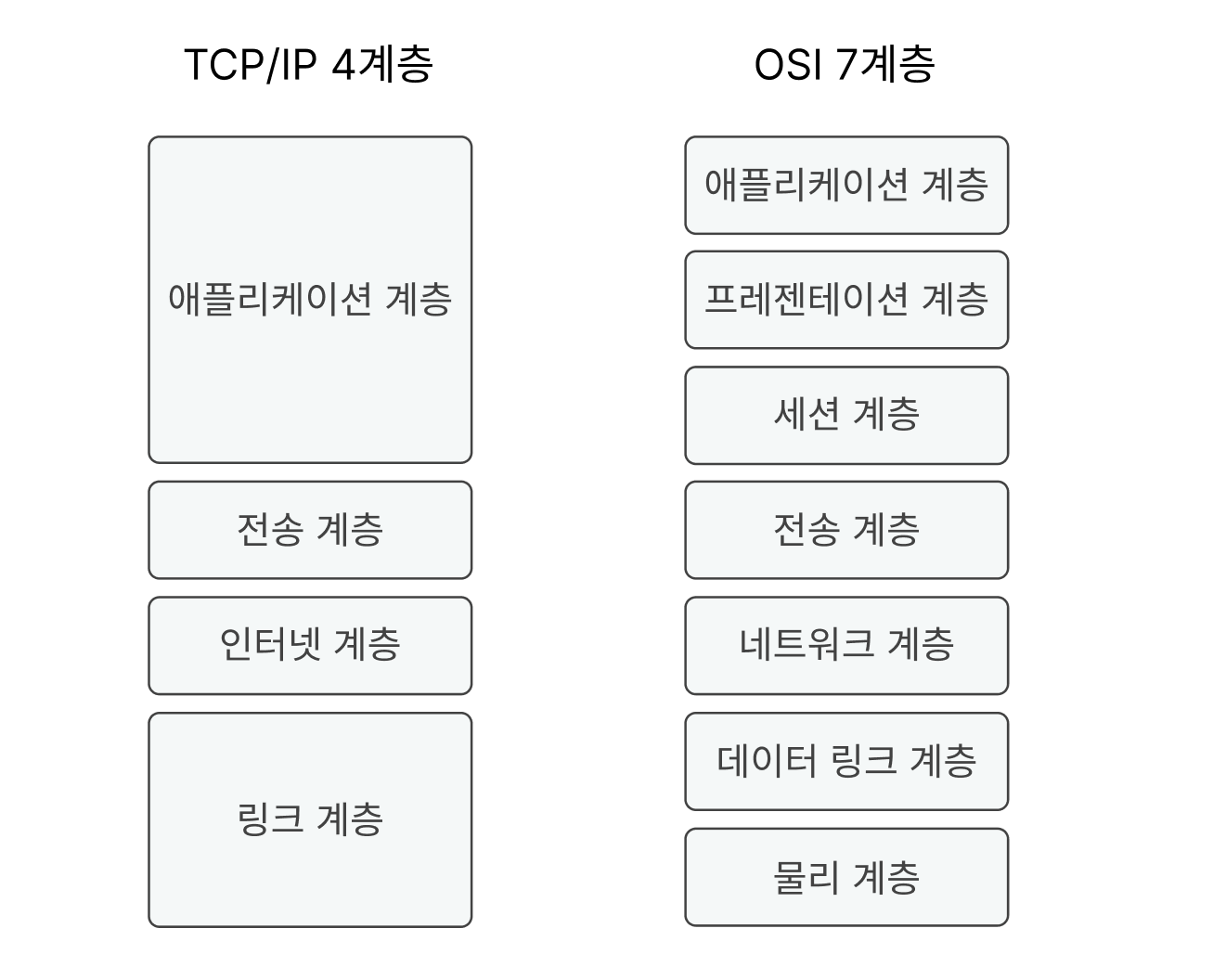 - TCP/IP 계층과는 달리 OSI 계층은 애플리케이션 계층을 세 개로 쪼갰음