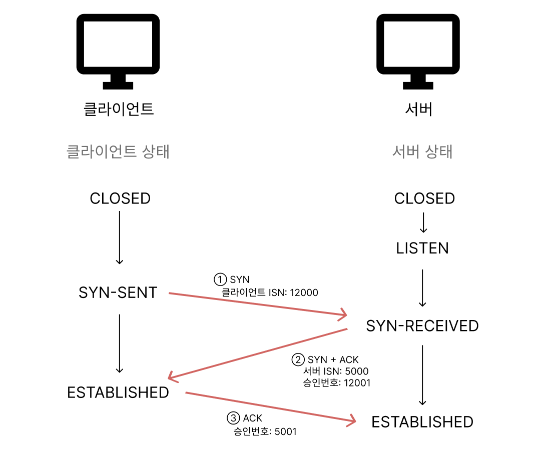 : TCP는 신뢰성을 확보할 때, '3-웨이 핸드셰이크(3-way handshake)' 과정이 진행됨