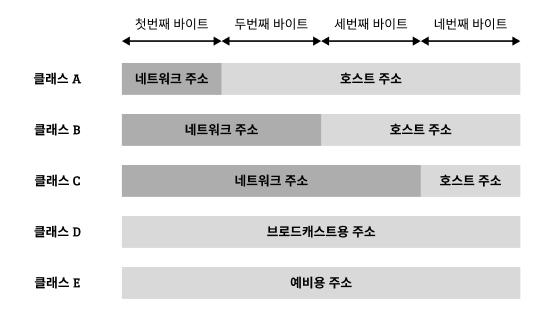 - 클래스 D는 멀티캐스트 통신, 클래스 E는 앞으로 사용할 예비용 주소