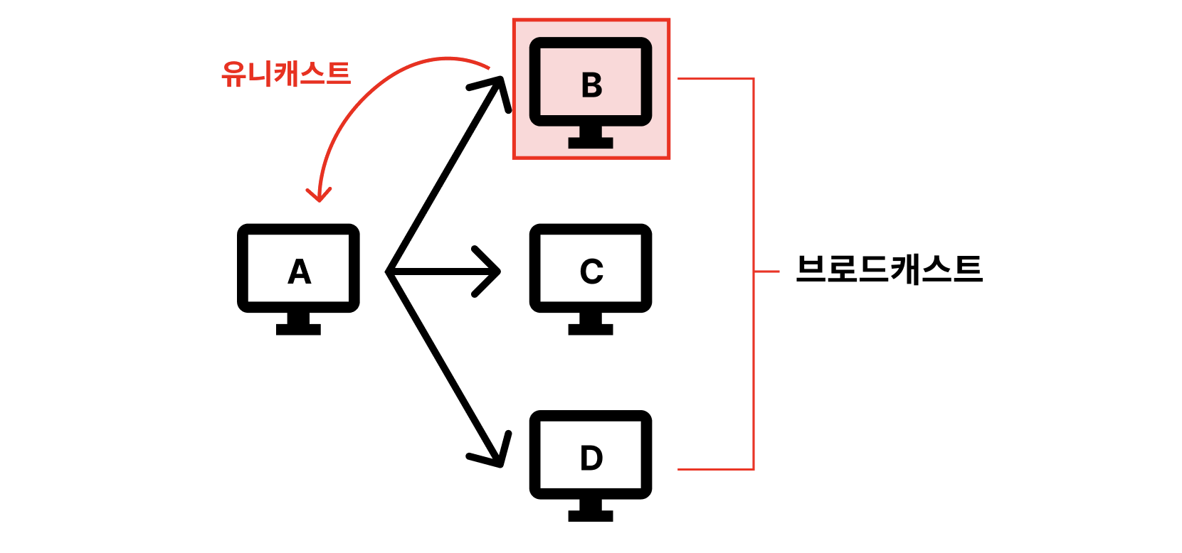 : 송신 호스트가 전송한 데이터가 네트워크에 연결된 모든 호소트에 전송되는 방식